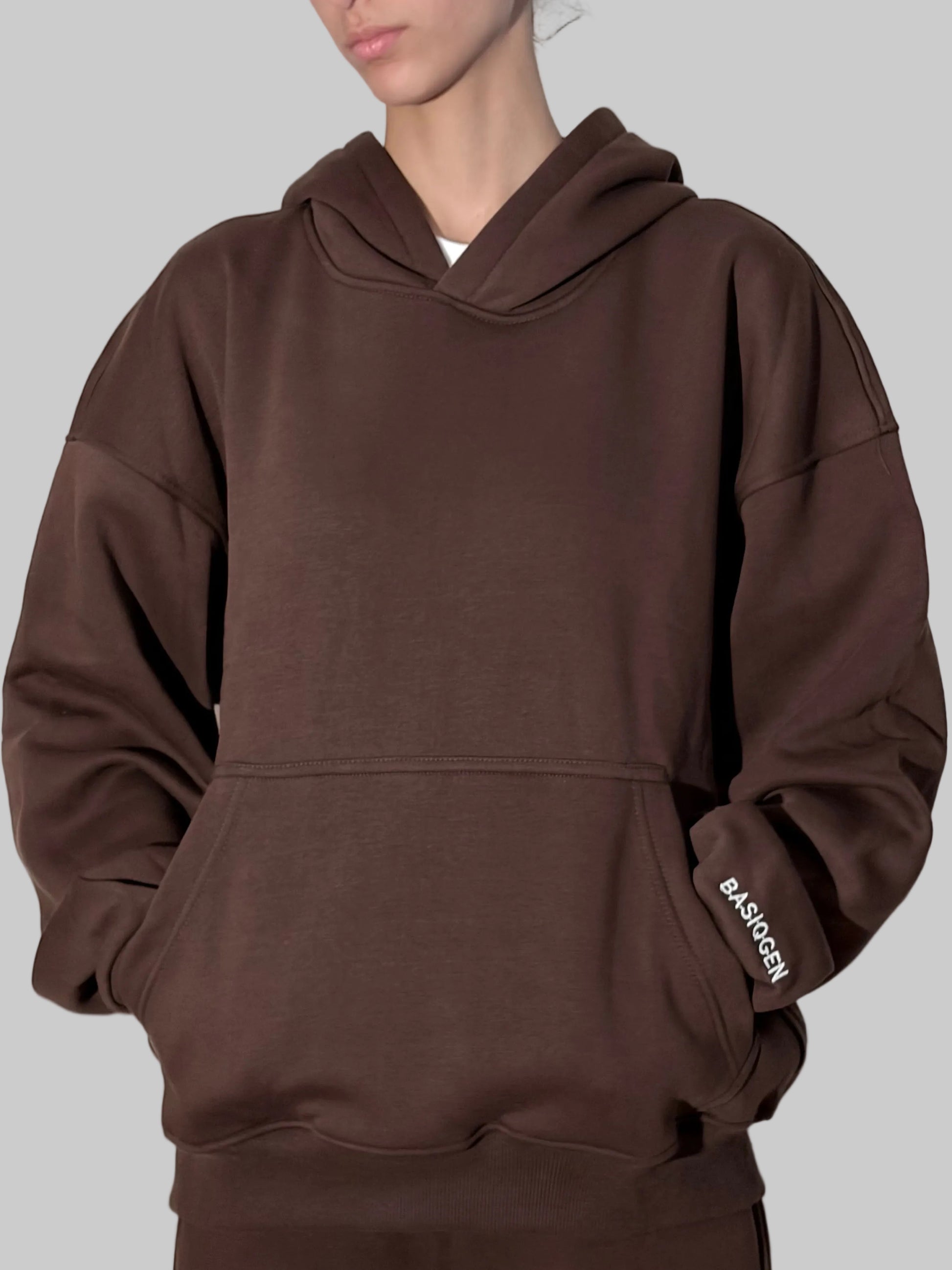 Crafted from a premium, soft-touch fabric blend, it offers exceptional warmth without sacrificing breathability. The relaxed, oversized fit ensures maximum comfort for lounging, while its clean design makes it perfect for layering or casual outings. Featuring an adjustable drawstring hood, a spacious kangaroo pocket, and ribbed cuffs and hem for a secure fit, this hoodie is built for both style and practicality. The subtle 'BASIQGEN' detailing on the sleeve adds a touch of signature branding.