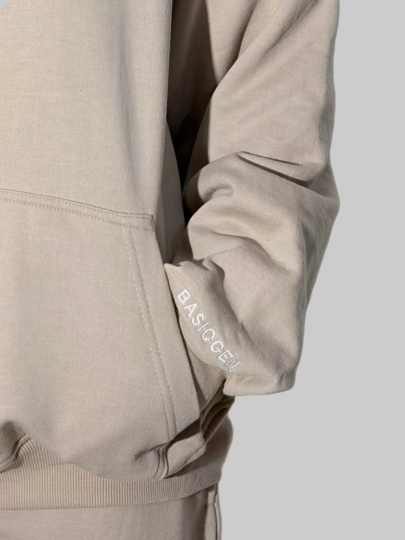Bold comfort meets understated edge with this Beige oversized hoodie that refuses to play it safe. Built from an innovative fabric blend that balances serious warmth with breathable performance, it's engineered for those who demand function without compromise. The deliberately relaxed fit breaks free from conventional silhouettes, delivering uncompromising comfort whether you're dominating your space or exploring the streets. Every detail serves a purpose: an adjustable drawstring hood that adapts to your needs, a deep kangaroo pocket for real utility, and reinforced ribbed finishes that hold their shape through constant wear. The signature BASIOGEN sleeve mark stakes your claim without shouting a quiet declaration of style that speaks volumes to those who get it.